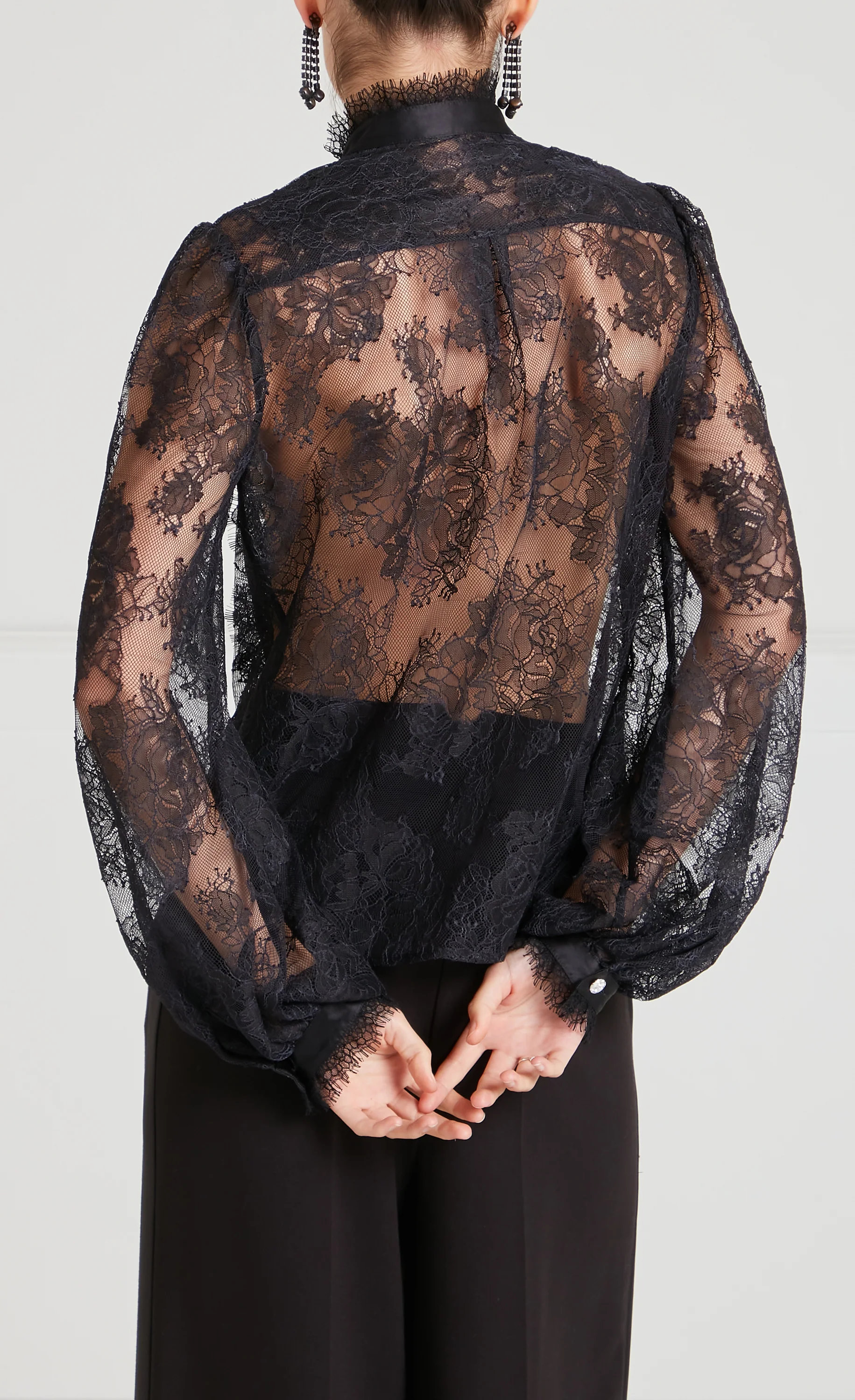 This black shirt combines Chantilly lace with silk satin for a flattering, tailored silhouette. A crisp white cotton piqué bib creates a striking contrast, while sheer lace panels add a hint of delicate sensuality that transitions perfectly from day to evening.