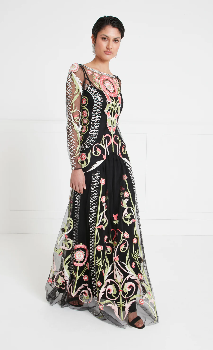 Honed to perfection, the Alessia sleeved dress is an effortlessly elegant yet statement style. Framing the contours of the body with soft Italian tulle, it flows fluidly from boatneck through the body panelling — showcasing the fine hand-embroidered detailing — into a ruched, floor-length skirt.