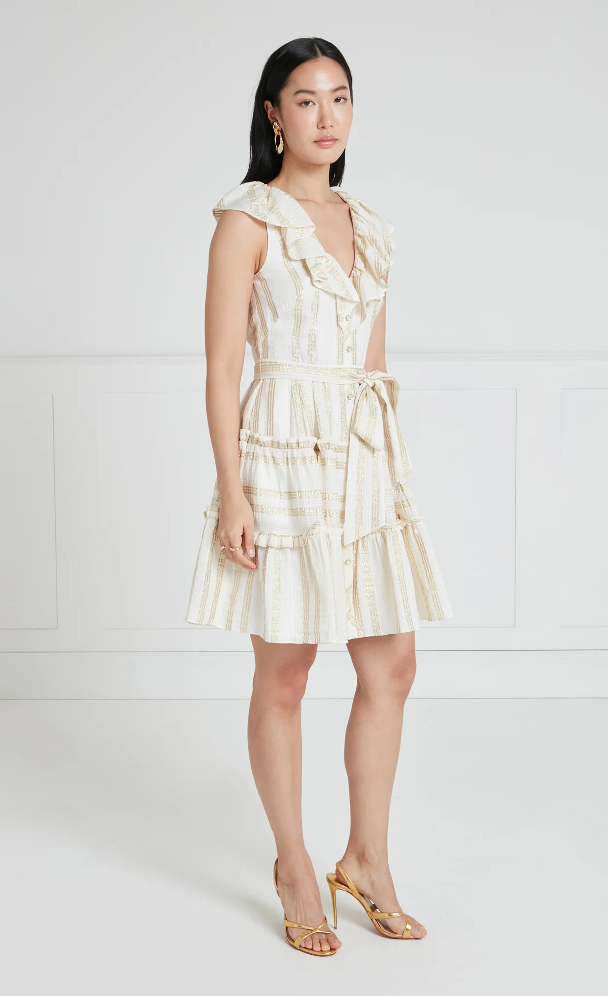 Embrace daytime sophistication in the Benoto mini dress. With ruffles cascading the neckline and a tiered skirt, it is ideal for those seeking a style that combines fun with elegance.