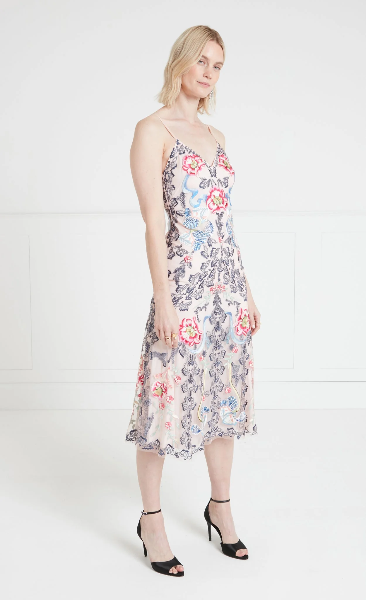 Exquisite full-stitch embroidery, engineered across the tulle overlay, highlights signature Temperley craftsmanship and standout patterns. It's crafted from stretch double georgette for comfort and layered with delicate tulle for depth and texture.