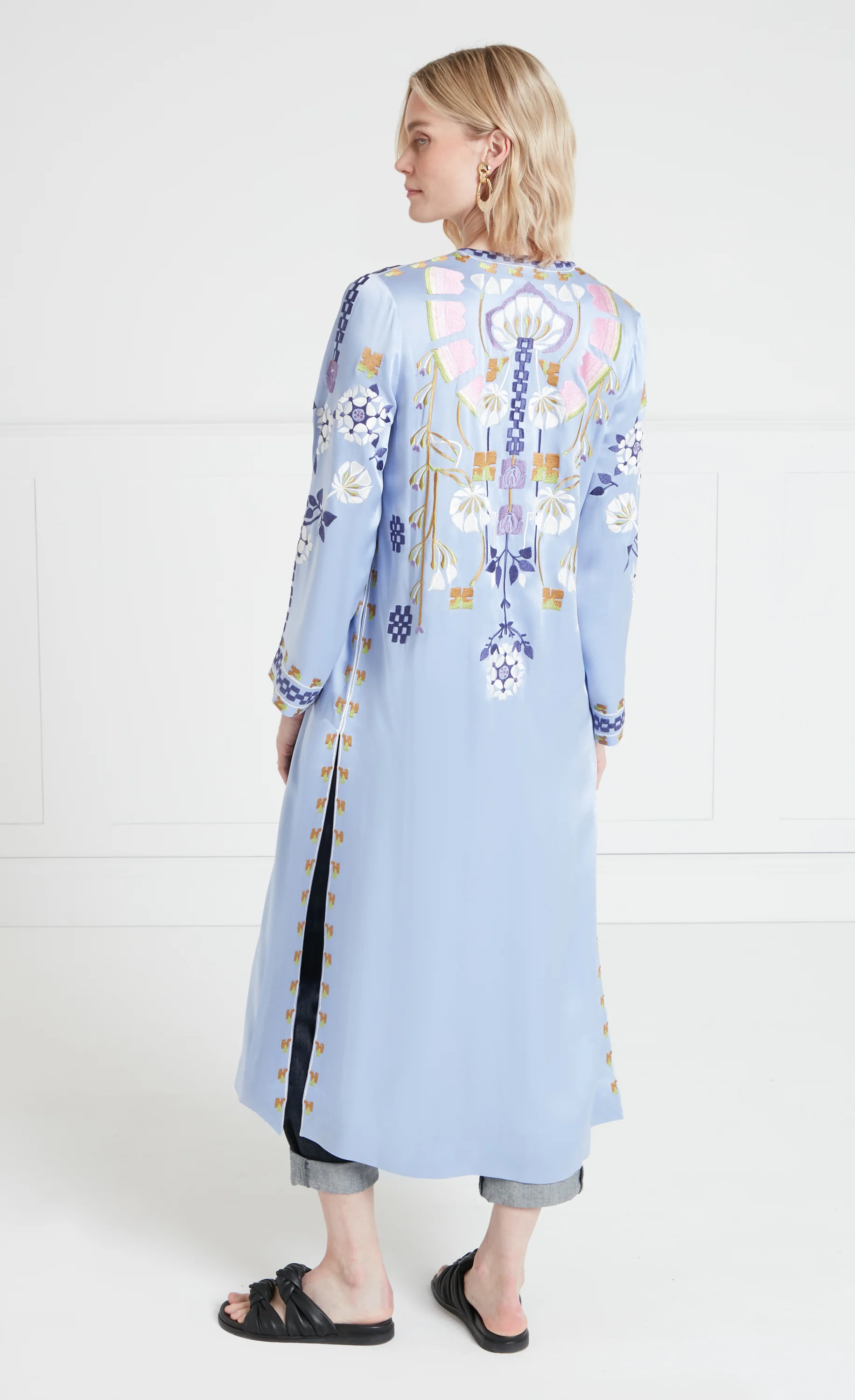 The Casa Coat is based on our signature kimono shape; a staple in Alice's wardrobe. It showcases exquisite full-stitch embroidery, intricately designed with inspiration from Spanish Art Nouveau.