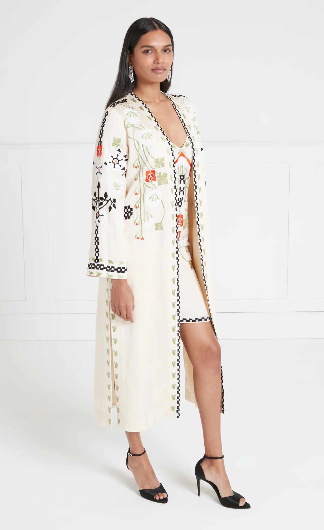The Casa Coat is based on our signature kimono shape; a staple in Alice's wardrobe. It showcases exquisite full-stitch embroidery, intricately designed with inspiration from Spanish Art Nouveau.