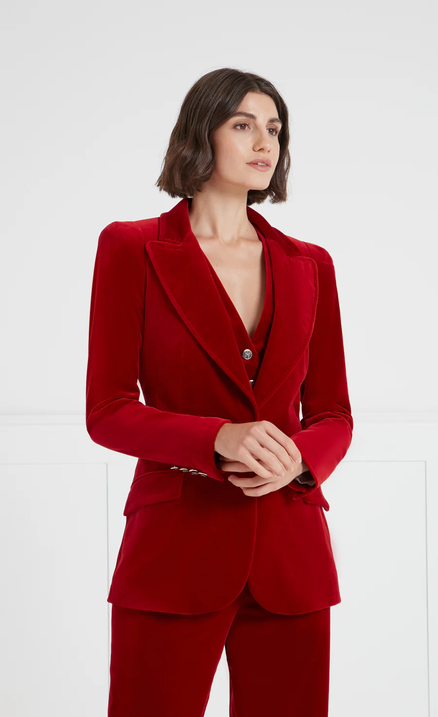 The immaculately tailored trio is crafted in Italy from luxurious Italian velvet, with 2% elastane for comfortable movement and structure.