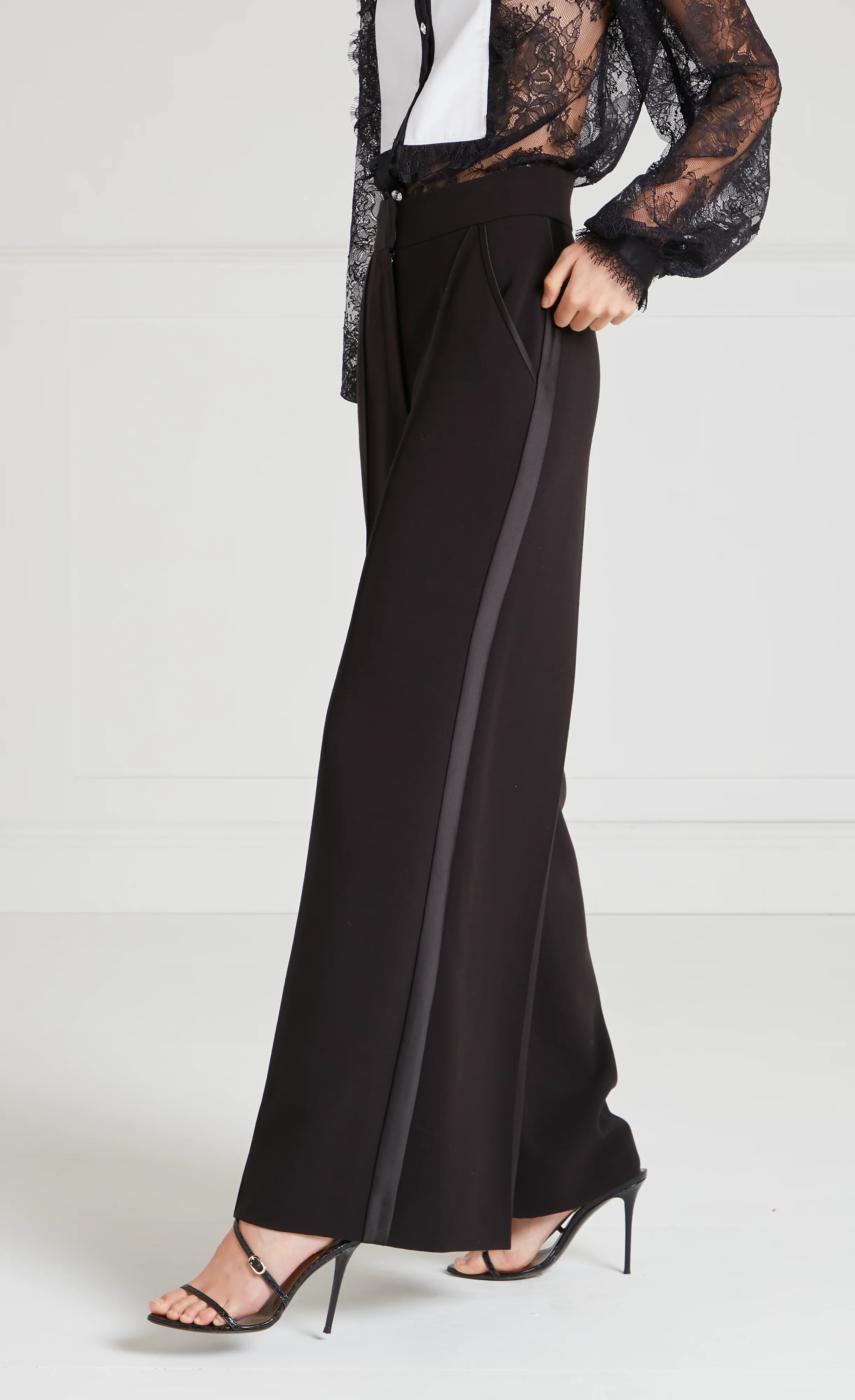 These lightweight black trousers are designed with a high waist and wide leg to create an elongated silhouette. The style falls fluidly from the hips, offering ease of movement combined with crisp pleats for structure, creating a versatile wardrobe staple.