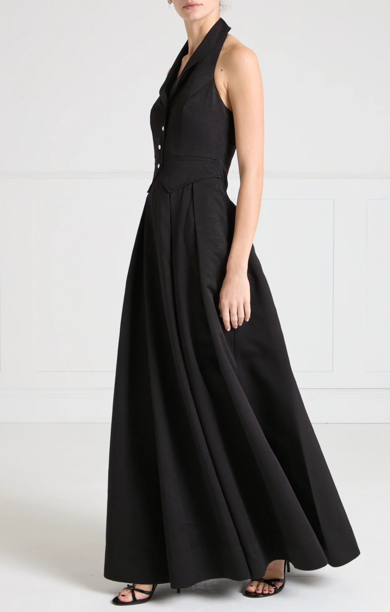Inspired by classic tailoring, this black halter dress features clean, structured lines for a crisp, stylish look. A fitted bodice enhances the silhouette with a chevron waist, falling into a softly pleated, full-length skirt. Effortlessly refined, this gown transitions seamlessly from day to evening with versatile styling options.