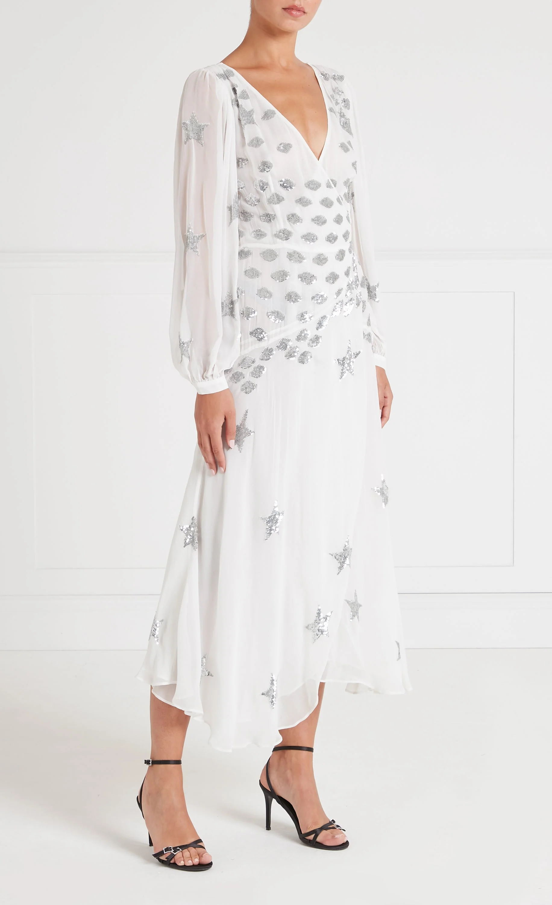 Based on one of Alice’s favourite dresses she wears over and over again, the Etoile Wrap Dress is adorned with sequin stars, scattered across light georgette with tulle accents. Featuring long sheer sleeves, a V-neckline, and a soft tie belt at the waist, the garment is elevated by a skirt that falls into delicate polka-dot tulle godets. A timeless yet fun party piece, it’s effortless to wear and endlessly versatile.