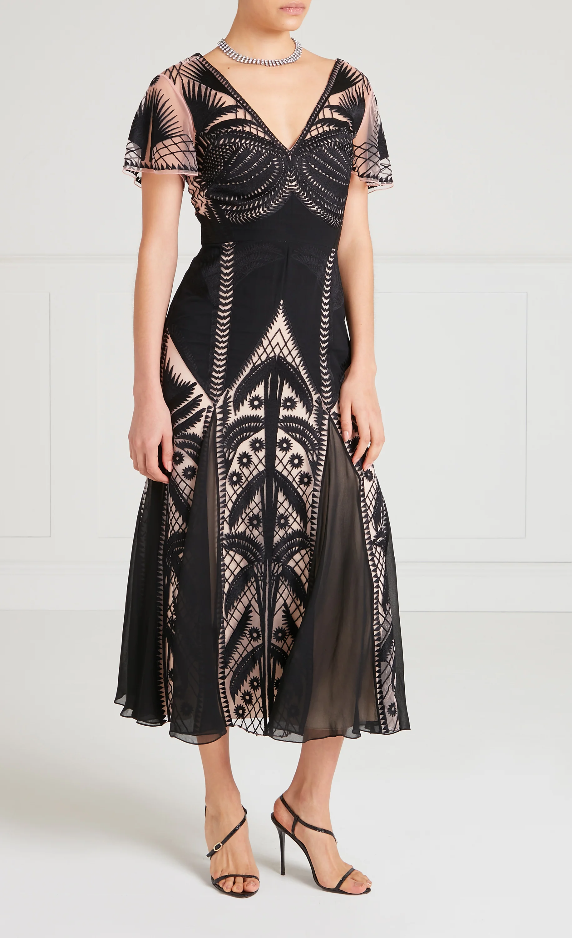 A fitted silhouette in midi length, this black dress is richly embroidered over soft Italian tulle. Strategic garment lines flow along the body with a nipped waist and wide neckline, creating a striking look for any occasion.