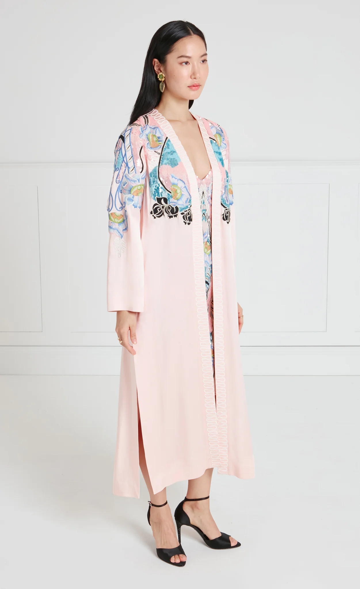 Rainbow fish scale sequins adorn this pale pink kimono-style coat for a textured, subtle shimmer. The beautifully blended thread work features corded details, creating a striking choice for daywear or evening occasions, especially paired with the matching mini-dress.