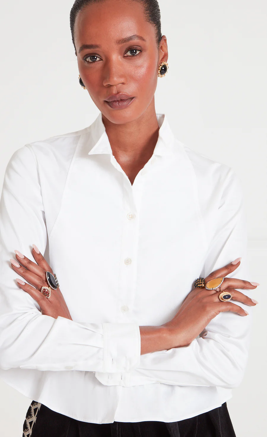 Endlessly wearable, the white June Shirt is a fresh and perfectly cut reworking of the timeless classic, with a playful collar and peplum hem. Enhance the sharp silhouette with a fitted jacket and culottes.