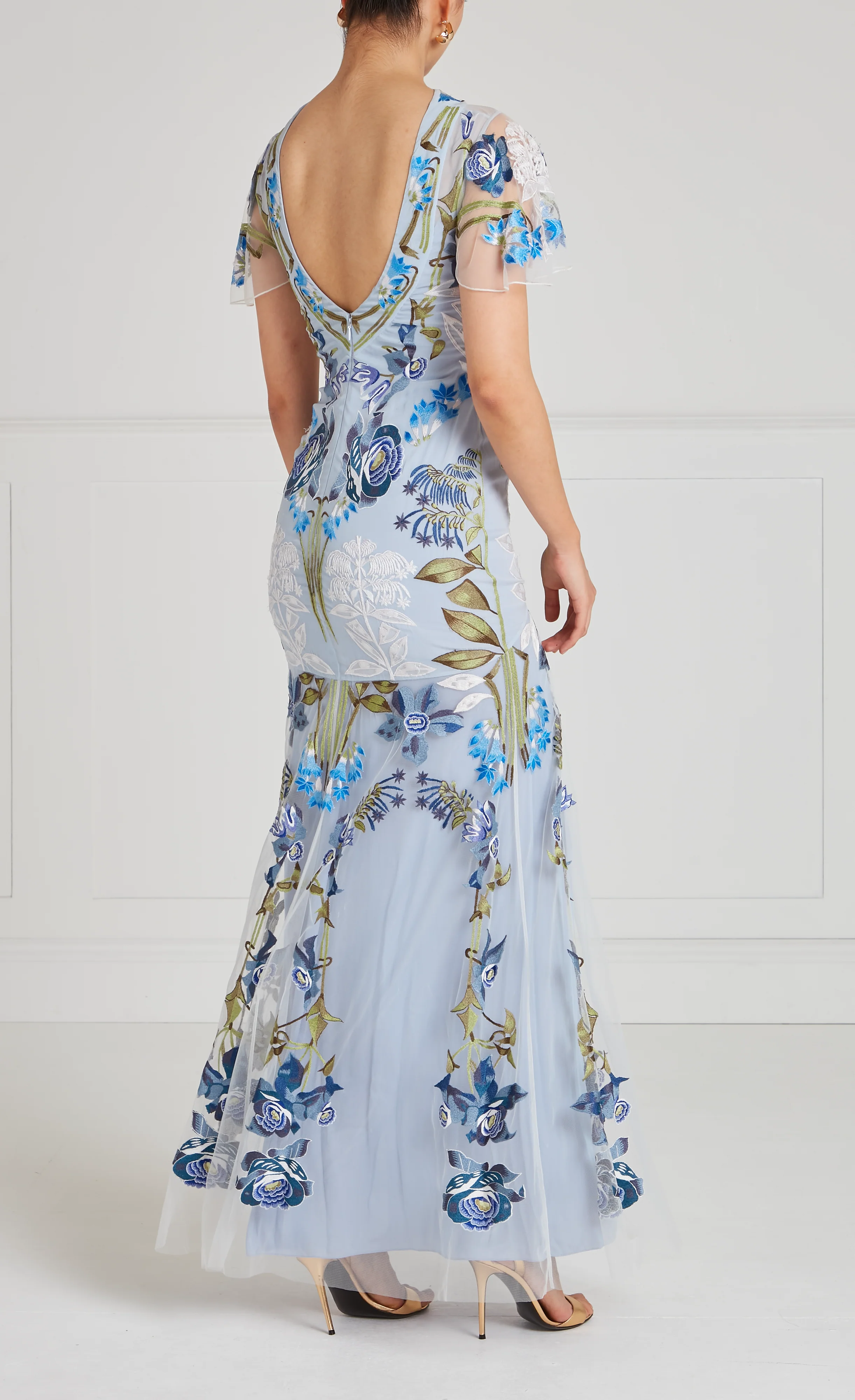 Hand-embroidered florals inspired by Art Nouveauāroses, camellias and blossomsāflow across the dress, positioned to complement and flatter the silhouette.