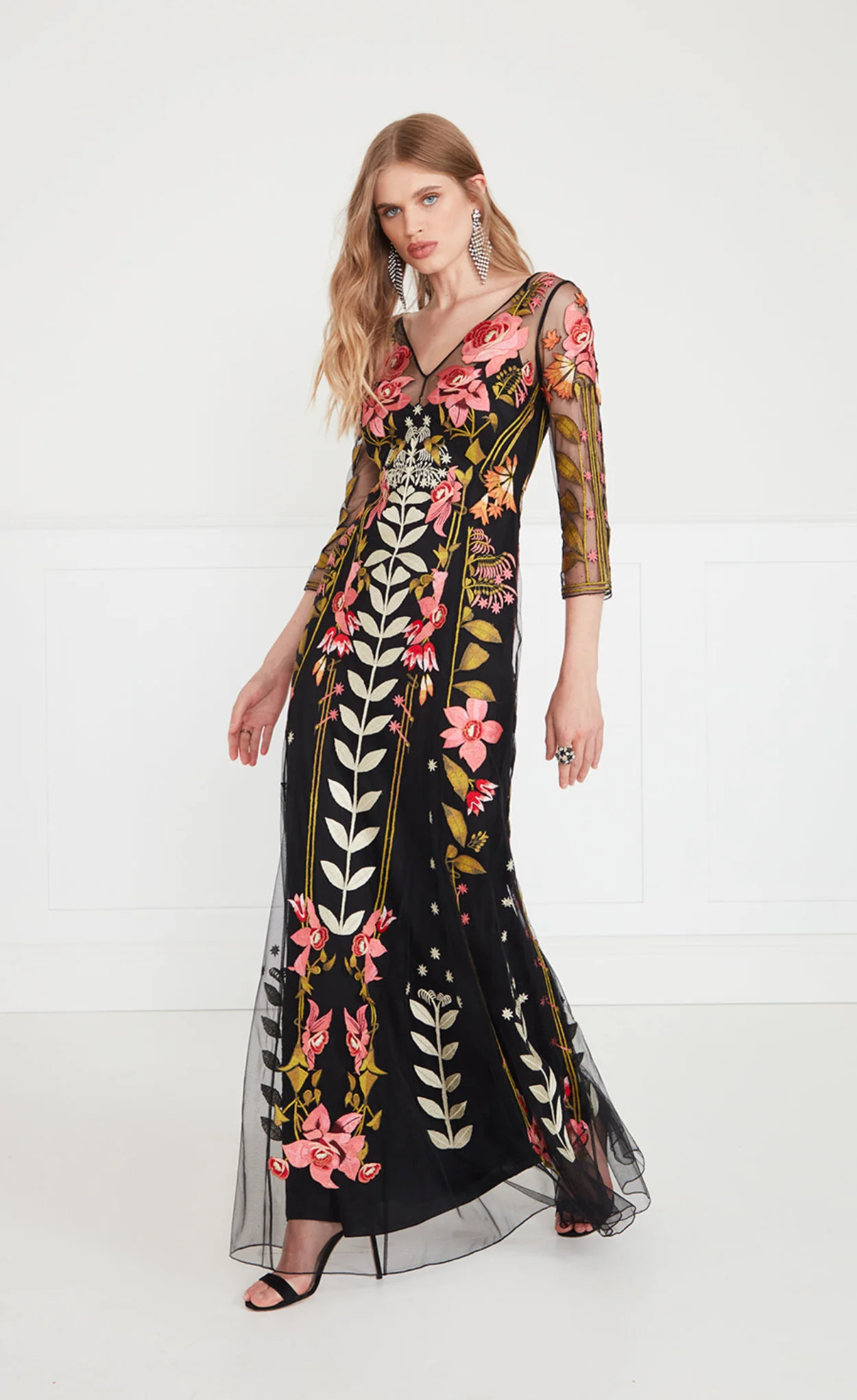 With sheer sleeves, a flowing maxi skirt and a feminine V-neck, the Lucille V-Neck Dress showcases hand-stitched embroidery. The Art Nouveau-inspired roses, camellias and blossoms are engineered to follow the lines of the figure.