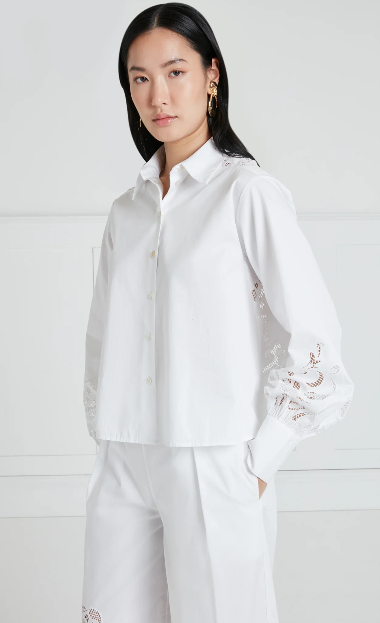 Showcasing our elegant engineered broderie anglaise design, the crisp cotton Nelle shirt features voluminous balloon sleeves with shirt cuffs. Pair it with the Nelle trousers for a polished summer look or wear it casually with your favourite jeans.