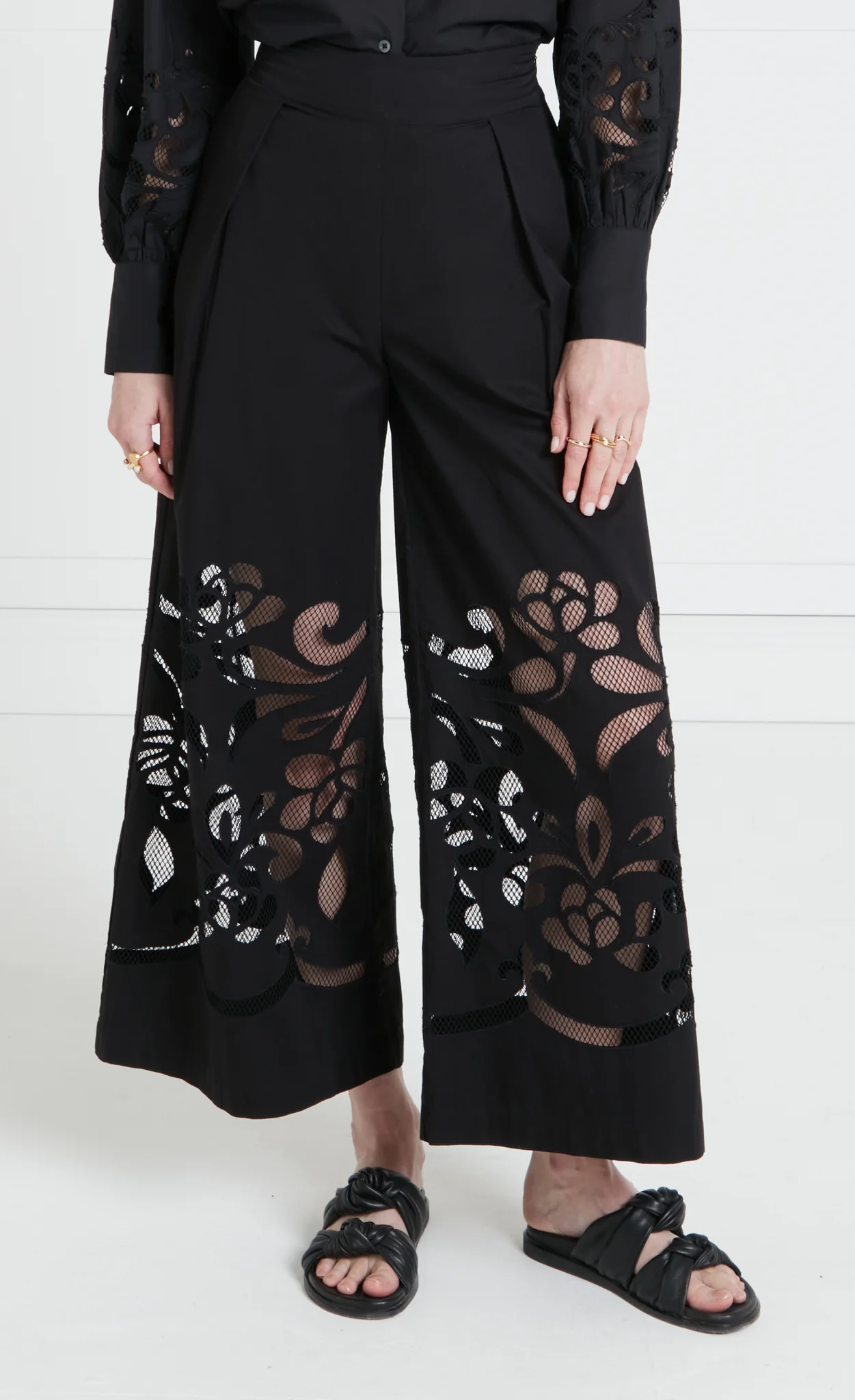 Showcasing our elegant broderie anglaise design, the crisp cotton Nelle trousers offer a relaxed yet refined silhouette. A fitted waist gives way to a volumous wide leg, with side pockets for added practicality. Pair them with the matching tops for a look of airy femininity.