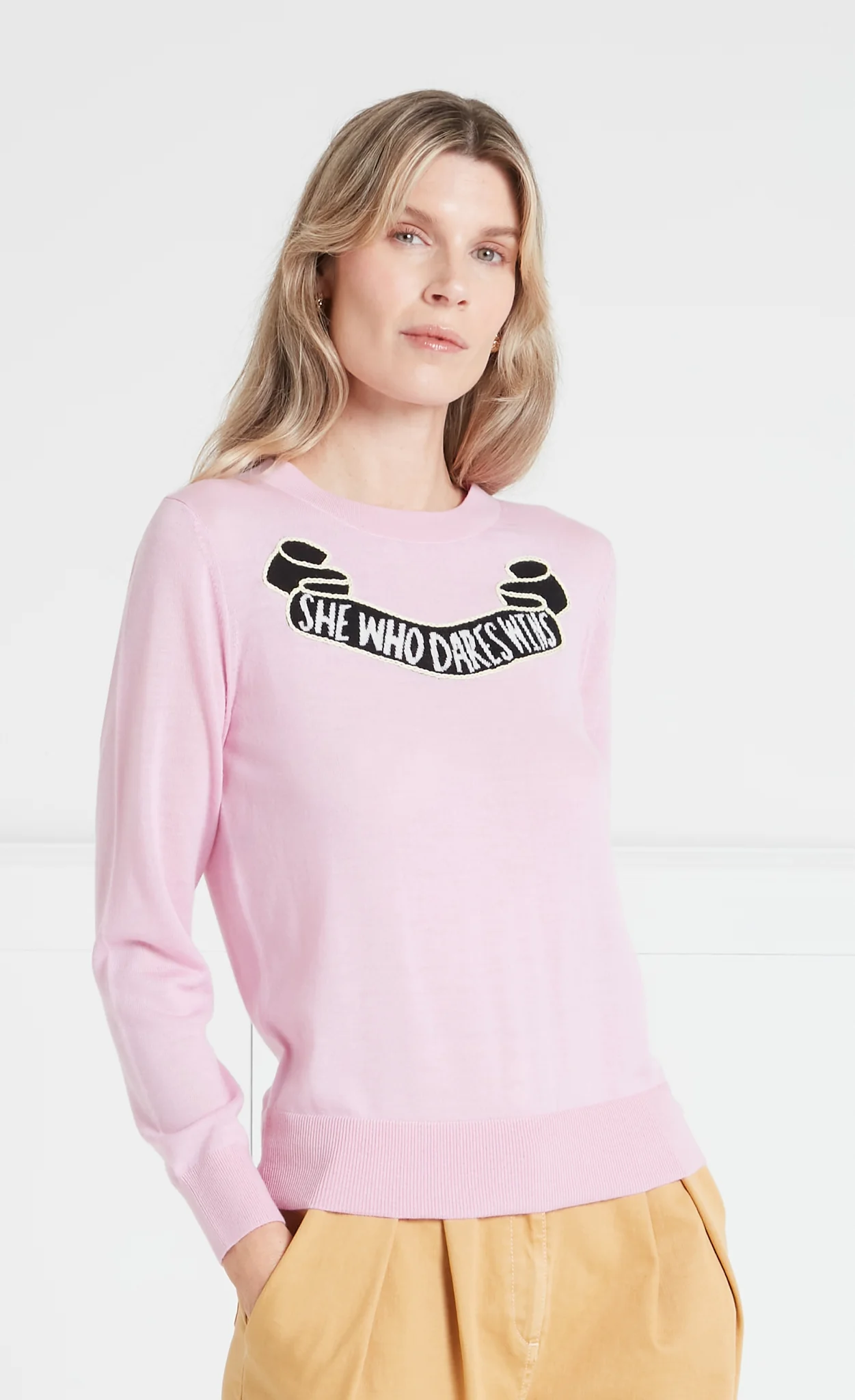 A returning brand signature, the slogan ‘She Who Dares Wins’ jumper pays tribute to fearless women, inspiring us all to stand out with confidence.