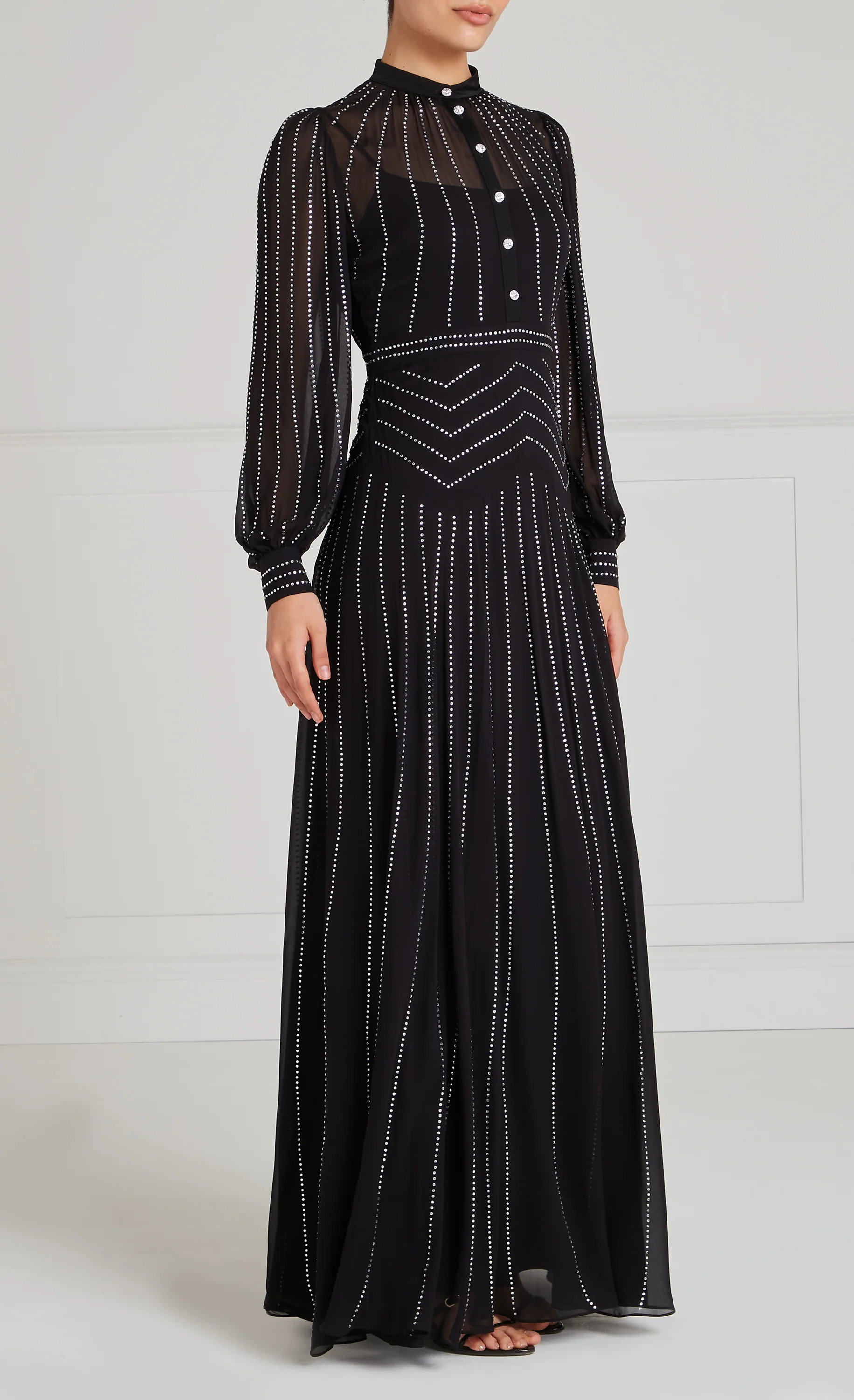 A nipped waist is emphasised on this black dress by contour lines of rhinestones and chevron yoke. Balloon sleeves echo the floating full-length hem, while fitted cuffs and modern collar add a sharply tailored touch to semi-sheer georgette.